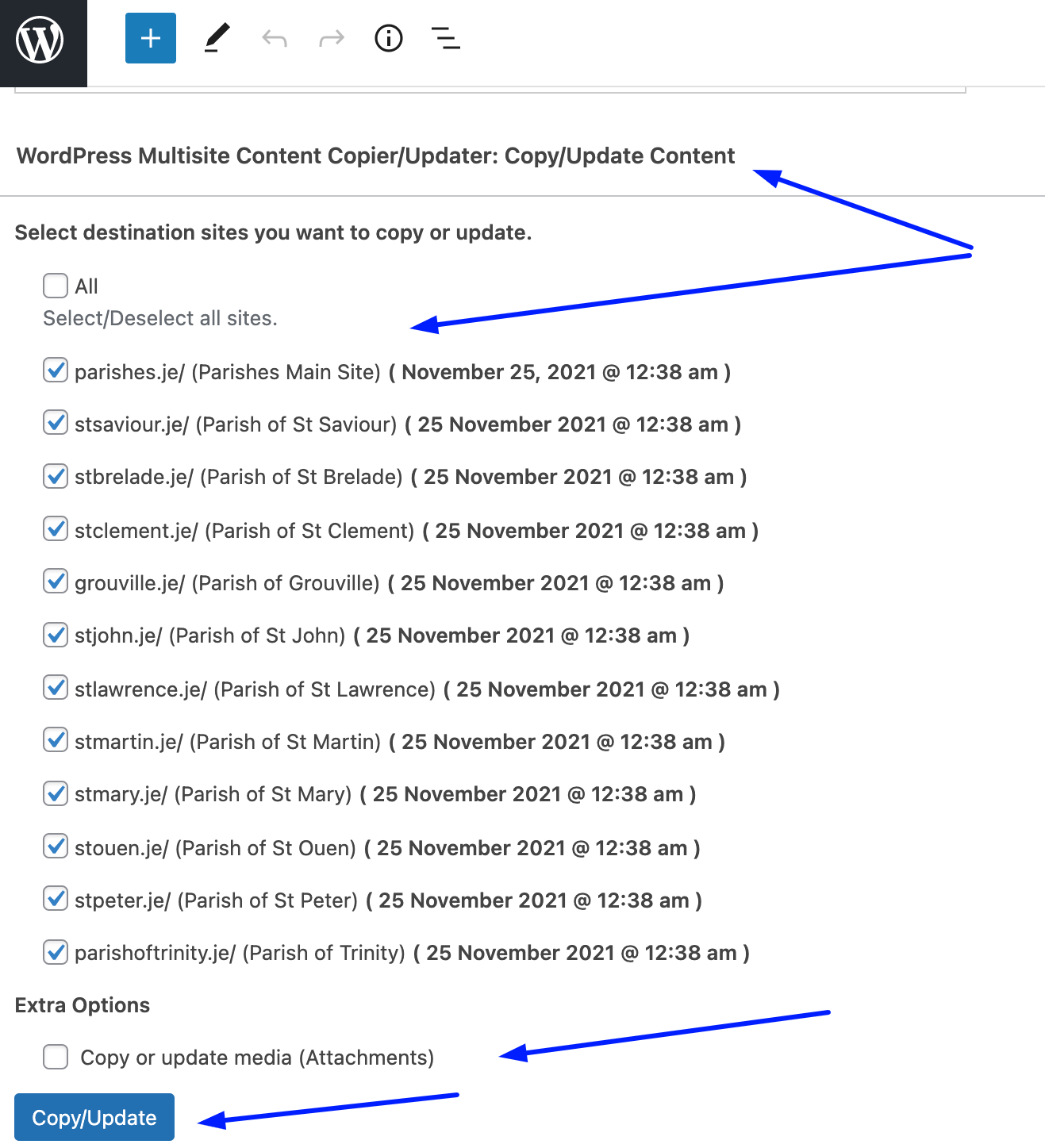 - It is recommended to not click on the Copy or update media (Attachments) as this will copy any attachments (such as PDFs) to each site and therefore there will be multiple copies. It is best to have one central copy on the comite.je site that each website references.